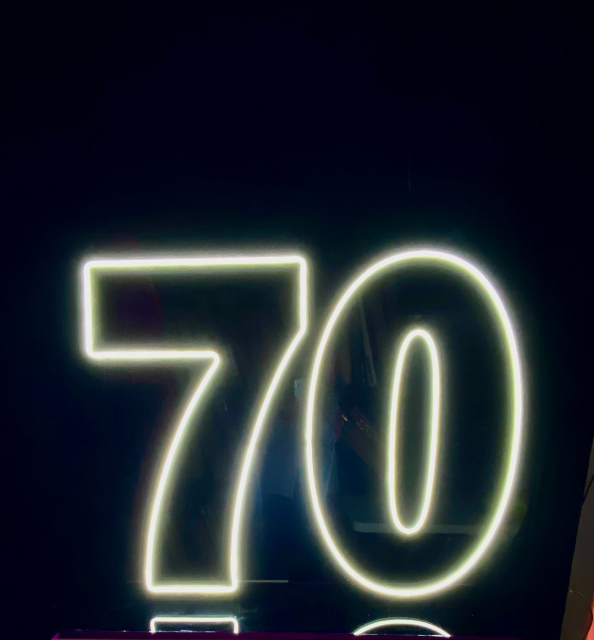 Seventy of anything is momentous — whatever your reason for choosing this sign, we salute you! This is a grandiose piece, it stands tall, bright and full of celebration. Fitted into a black acrylic table or floor stand, this white LED neon 70 is the perfect centerpiece. W1200 x H990mm As this is a significant milestone, we recommend you look through our other Birthday and Milestone items for a truly memorable celebration.