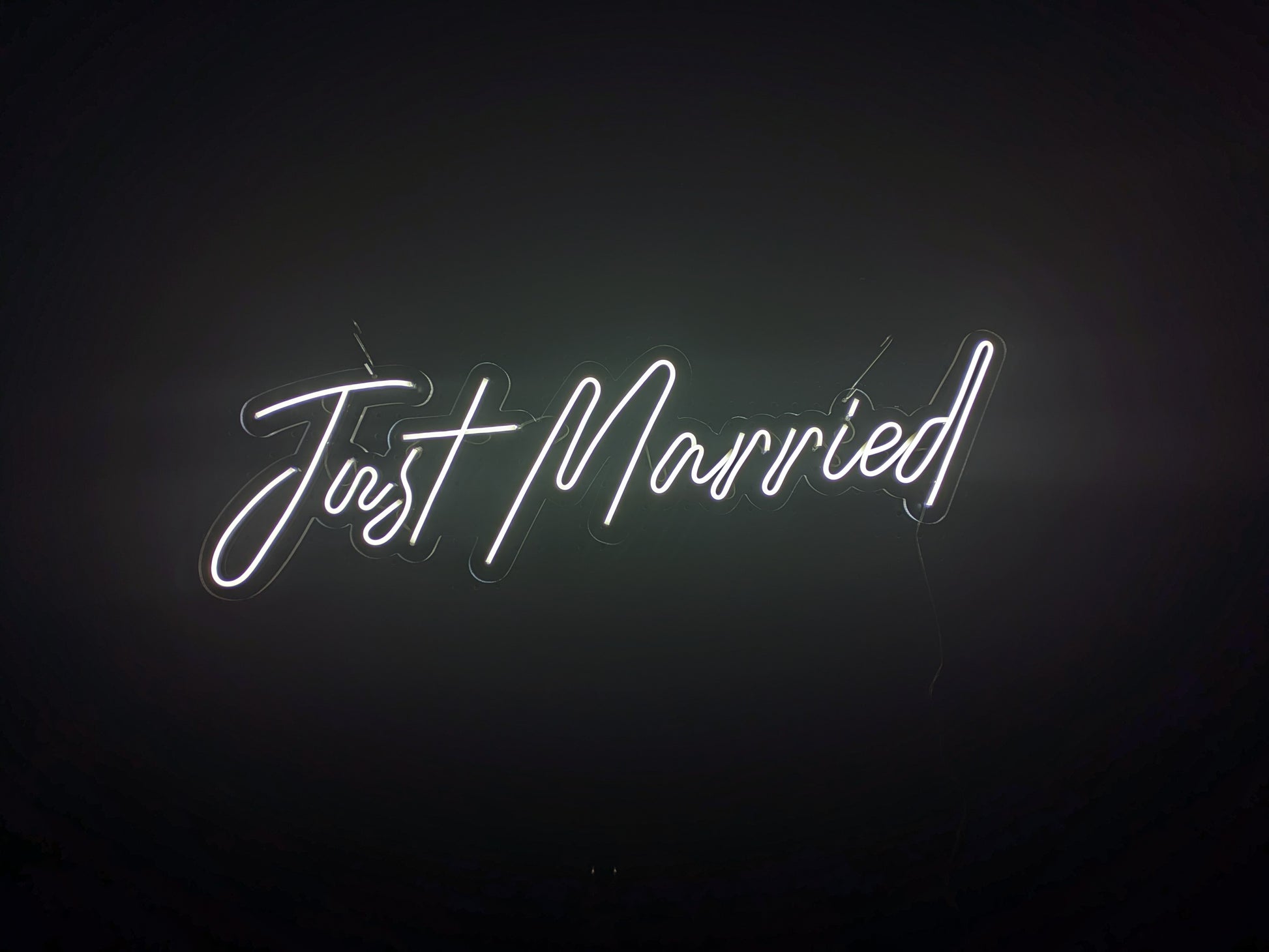 Weddings can get hectic — lucky we've got this subtle white neon Just Married sign to remind newlyweds and guests why they're all there in their finest, eating chicken and dancing the macarena. W940 x H260mm If you're looking for something more, check out our larger Just Married sign along with an array of neon wedding signs for hire.