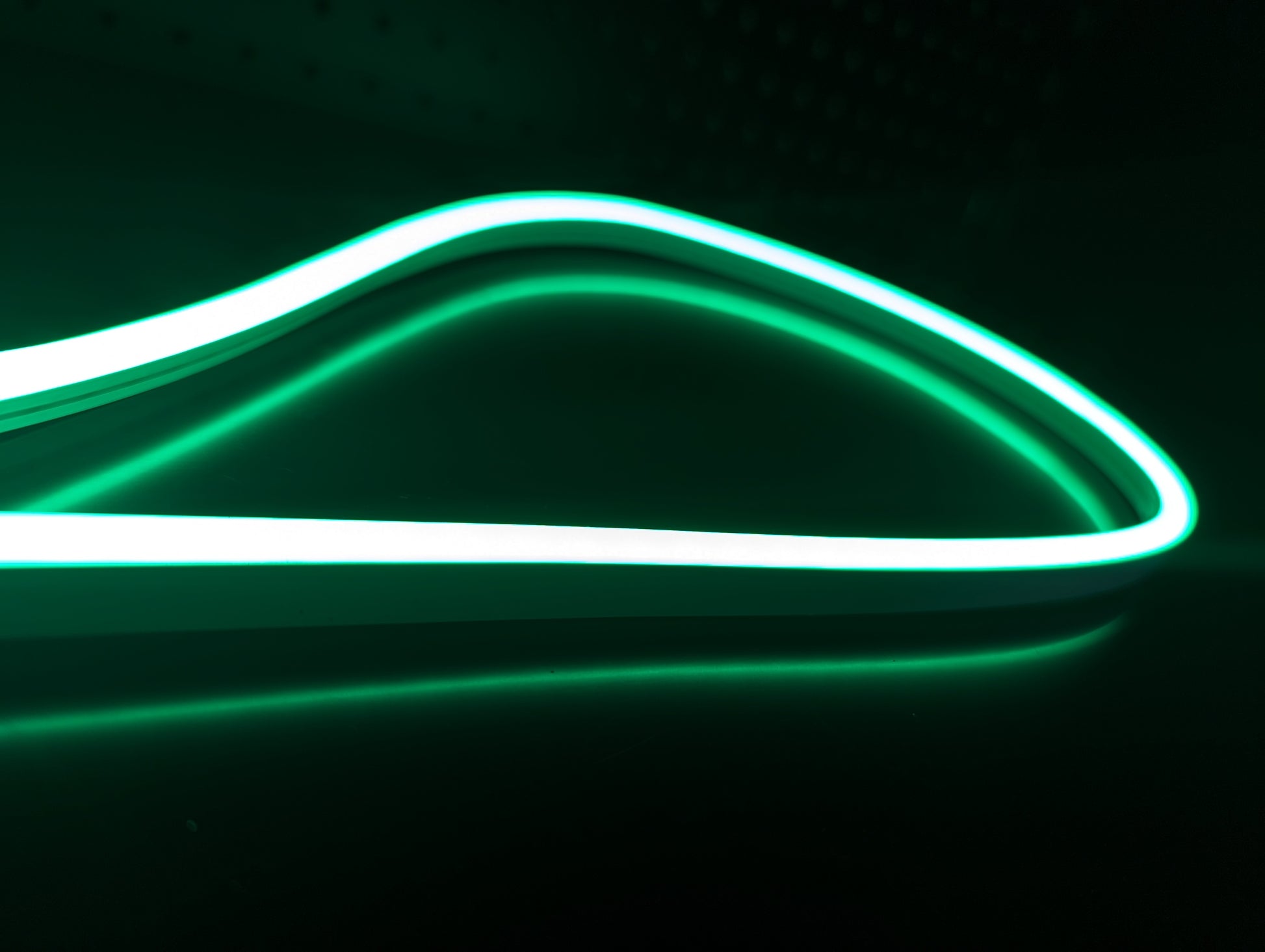 This LED neon strip illuminates a green light with dimensions of 6mm width and 12mm height. It operates on 24V DC power and consumes 10 watts per meter. Available for purchase by the meter.