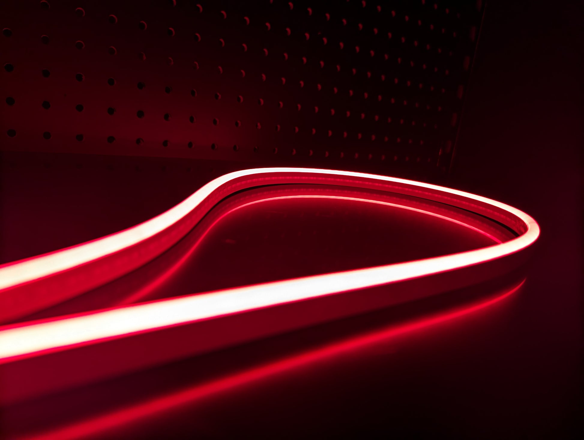 This LED neon strip features a red color with dimensions of 6mm width and 12mm height. It operates on 24V DC power and consumes 10 watts per meter. Sold by the meter.